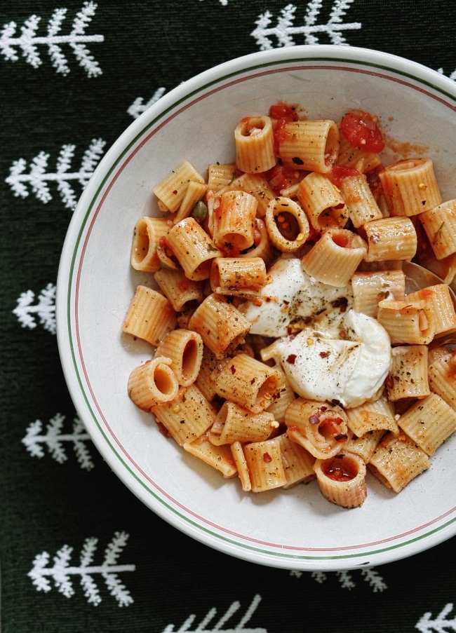 Traditionnellement, on y met des anchois… mais comme je ne les aime pas trop, j’ai créé ma version sans, en misant tout sur le trio gagnant : ail, olives et câpres. Le résultat ? Une sauce parfumée et relevée, adoucie par un généreux morceau de Bufarella fraîche au moment du service.