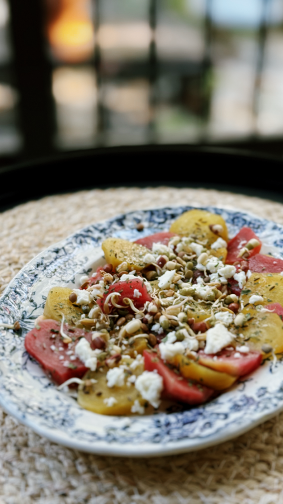 Les betteraves jaunes et Chioggia apportent une belle touche visuelle, la feta un côté crémeux et salé, et les germes une note croquante et vivante. Un plat léger qui se déguste aussi bien au lunch, en entrée ou en accompagnement d’un poisson ou d’une viande grillée.