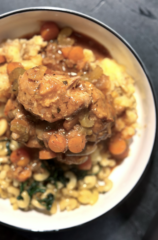 J’ai servi cet osso buco de porc avec un restant de macaroni cuit, simplement sauté à la poêle avec des épinards frais, un filet d’huile d’olive, une gousse d’ail, du sel et du poivre.