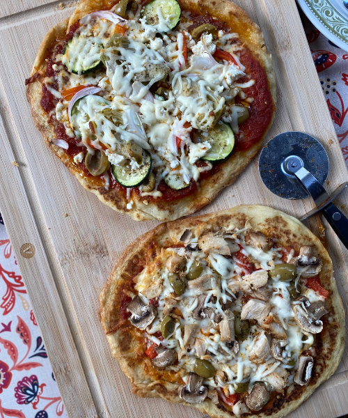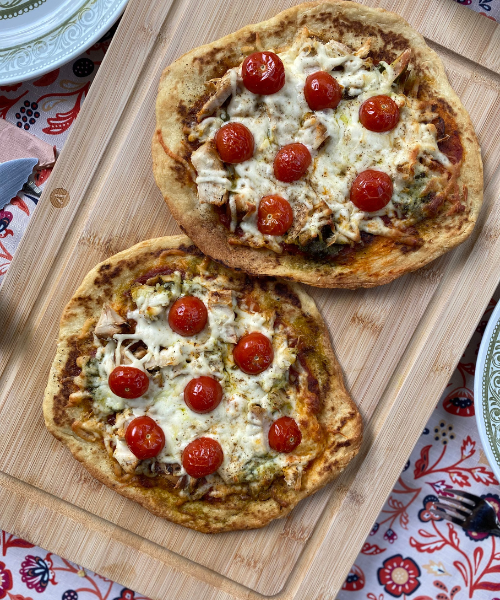 Le naan devient une croûte parfaite : croustillant à l’extérieur, moelleux à l’intérieur. Un vrai délice pour des pizzas maison rapides et créatives. Ce soir-là, nous avons préparé trois versions : poulet pesto, végétarienne et all dressed.