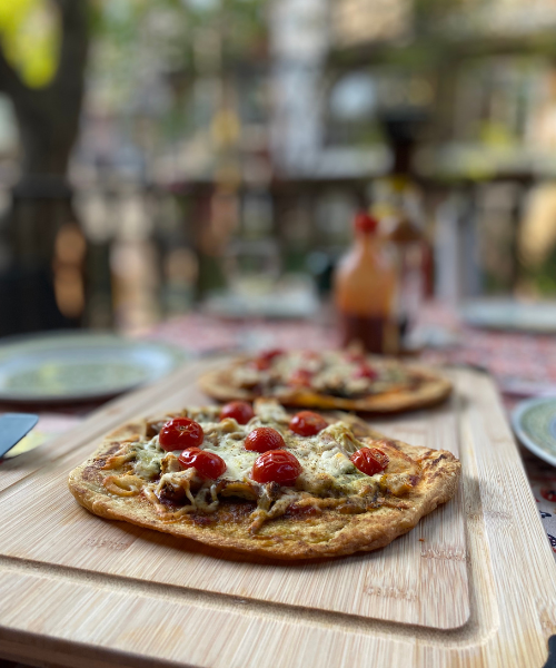 Un soir, mon amoureux et moi avons eu envie de revisiter la classique pizza… mais d’une façon simple et originale. Résultat : une première expérience avec le pain naan comme base, et on a tout de suite adopté l’idée !